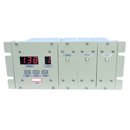地上波デジタル放送及びFM放送に対応した機能を持つ空中線監視装置です。 TV及びFM送信機用の給電線や空中線系に取り付けた結合器から入力したVSWR測定用の進行波・反射波検出信号、DCR(直流抵抗)測定用の信号及びデハイドレータ動作信号を送信機の動作中に常時監視して測定値の表示を行うと共に、その値が警報設定値を超えると外部へ警報信号を出力します。