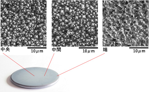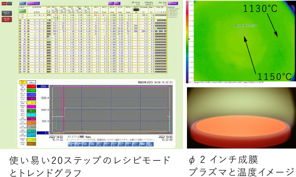プラズマの形状を従来の球状 → 円盤状に変更することにより成膜範囲を広げφ3インチ成膜を可能にしました。マイクロ波源は2.45GHz 5kWであり、装置サイズは従来のφ2インチ装置と同等です。